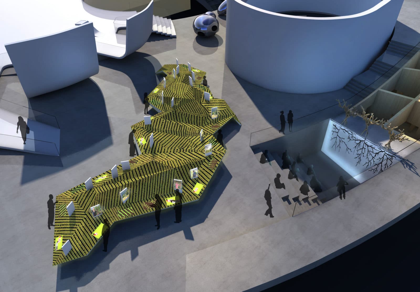 La structure porteuse sera en béton pour répondre aux charges importantes. La façade organique sera en lamellé collé, une membrane étanche la revêtira. L’utilisation du bois est un rappel à la culture viticole, un clin d’oeil à la souche de vigne. Le bois est également présent après les vendanges à travers les outils qui permettent de macérer le vin et le faire vieillir. L’ombrière sera constituée de verre sérigraphié de teintes variables. Les écailles pourront être ouvertes comme fermé.